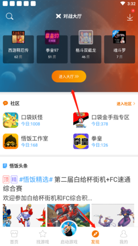 1、打开软件,点击发现选项,然后选择进入大厅功能。