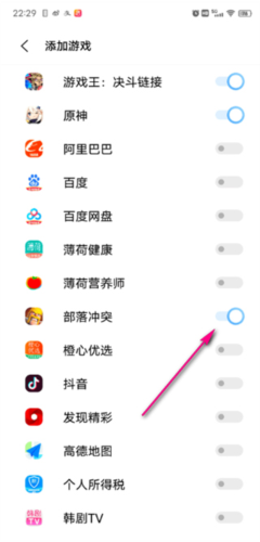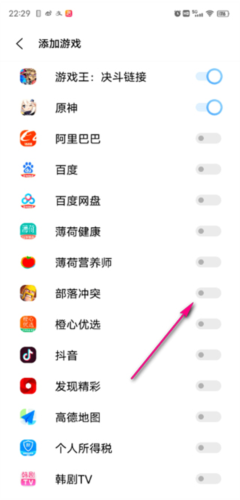 5、在列表中找到希望添加的游戏,点击其右侧的开关按钮;