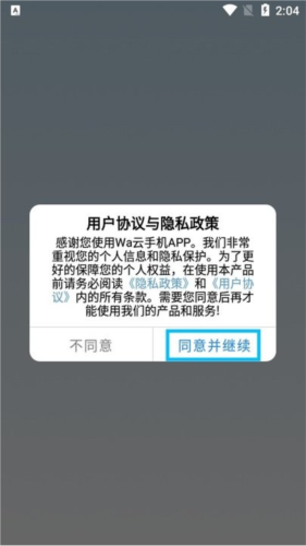 ·从本站下载并打开Wa云手机应用,仔细阅读弹出的用户协议与隐私政策,点击【同意并继续】按钮;
