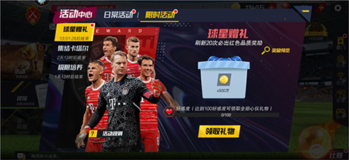 务必积极参与界面上方的各类限时活动。无论是开局的一周十连抽,还是新手嘉年华中的内马尔奖励,都能极大提升阵容实力。活动难度适中,奖励丰厚,是提升战力的重要途径。这些活动均有时间限制,错过无法弥补。