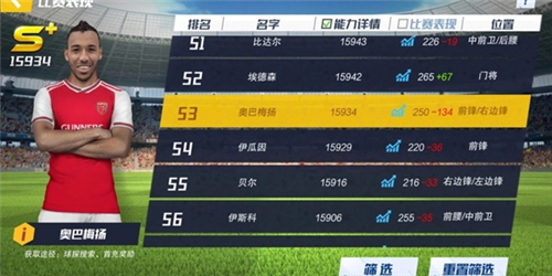 奥巴梅杨战力次之(15934),可出任前锋与右边锋,适配阵型较广,但技能与位置契合度偏低。