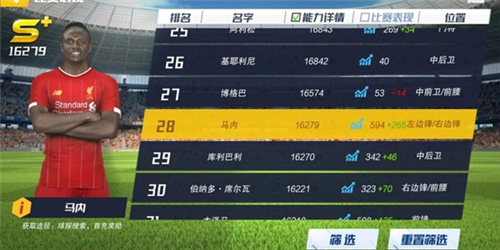 其中马内战力最高(16279),可担任左右边锋,但需搭配三前锋阵型,灵活性稍显不足;球员技能与位置契合度中等。