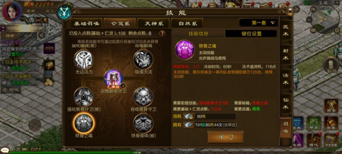 该系特色技能较少,主要侧重提升物理防御的辅助能力。例如“铁骨之魂”可增加屏内队友物防;终极技能“铁骨御体”按百分比提升自身物防。适合搭配魔减套装的玩家。但其合体技能冷却时间长,实战作用有限;且核心召唤物“骸骨守卫”为近战攻击,群战中易阵亡。因此,主要推荐给喜欢挂机跟随队伍完成任务的玩家。