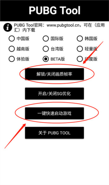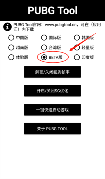2、打开软件进入主界面,选择对应的PUBG版本(PUBG国际服体验服对应BETA版);