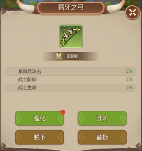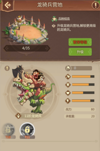 1、游戏包含四种兵种:战士负责承受伤害;猎人攻击力突出;龙骑兵野外行军迅速;巨兽野外运输资源效率高。不同兵种在攻击、生命、防御、速度上各有差异;同一兵种阶数越高,属性也越强。