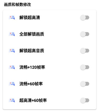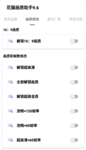 2. 进入画质修改页面,可以使用解锁16:9画质、解锁超高清、全部解锁画质、解锁超高音质、流畅+120+60帧率、超高清+60帧率等功能。