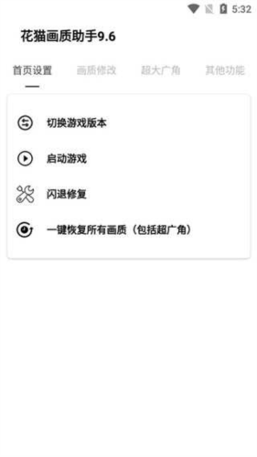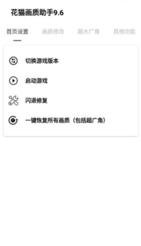 1. 从本站下载花猫画质助手后,在软件首页可以使用切换游戏版本、启动游戏、闪退修复和一键恢复所有画质等功能。