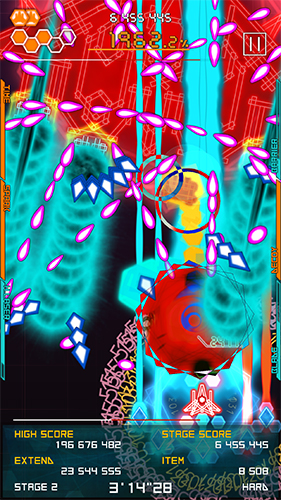 ③号后期机体:主打贯穿攻击。主武器为范围散射,射速慢但可穿透。僚机首次出现红色弹幕。炸弹会在原地放置一个吸引火力的“影子”,并以其为中心消弹。切换机体后,僚机会短暂聚集于切换点形成“影子”,并转为近距离光线攻击,此时释放炸弹会直接在“影子”处产生消弹圈。
