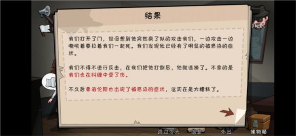 (2)外出探索:试图外出寻找机会,有可能发现避难所并触发特定结局;但更大概率是遭遇变异者群体,导致生存失败。