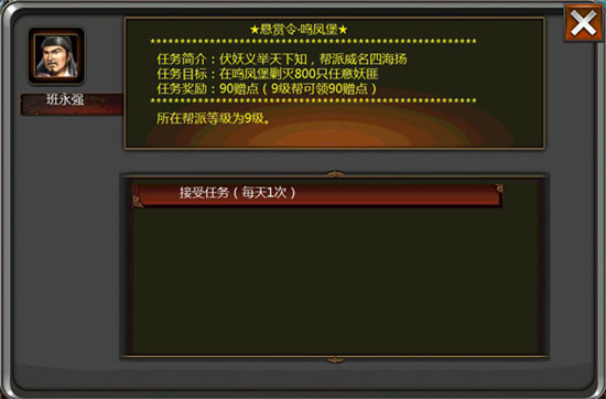 每周一至周五8:00至23:00,已加入帮派的玩家可前往双龙城班永强处接取帮派悬赏令任务;任务内容及完成后获得的赠点数量,将根据所在帮派等级有所区别。
