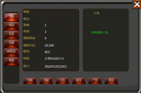 1、加入帮派后,玩家可在“资料”界面查看帮派等级、资金等基本信息;右侧公告栏会显示帮主发布的公告。成员点击下方的“贡献”按钮,可捐赠天石或银两以获取个人贡献值;贡献值累积到一定数额,将自动晋升对应帮派职位。