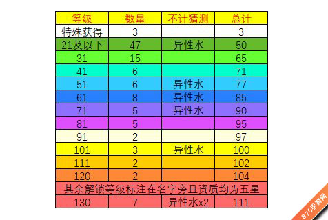 41级为七十一位;51级为七十七位;61级为八十五位;71级为九十位;81级为九十五位;91级为九十七位;101级为一百位;111级为一百零二位;120级为一百零四位。