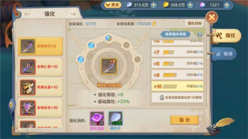 3、装备强化需要消耗龙晶强化石和银叶子,每次强化格数随机。装备更换后,强化等级可以继承。当强化度和完美度达到一定标准,强化目标进阶可提升属性与战力。
