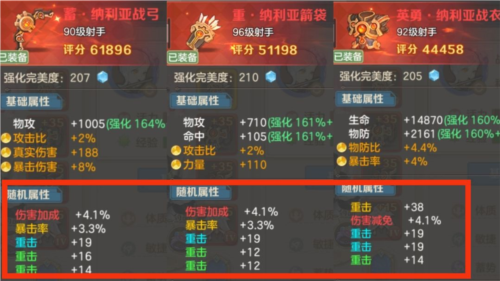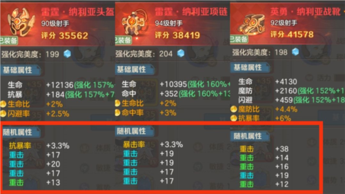 如图红色框内所示,这三件装备属性共五条,包括一条红色属性、一条橙色属性及三条蓝绿不等的属性。将它们归为一类,是因为只有这三件装备固定拥有一条红色和一条橙色属性,红色属性值最高,橙色次之。因此打造时必须先洗出红色和橙色属性。