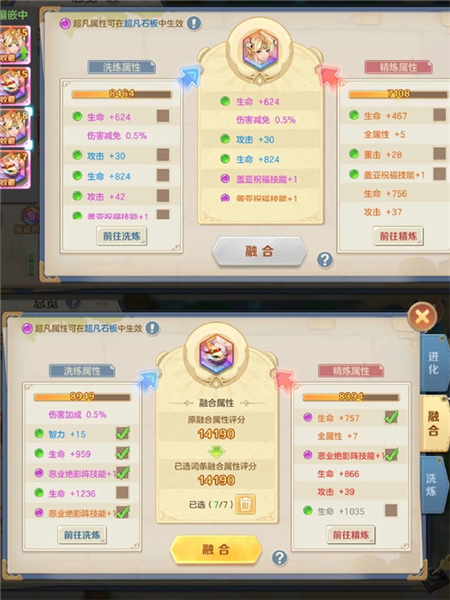 此过程与普通洗练类似,区别在于保存的属性仅为备选,未融合前不影响已生效的属性;因此玩家可放心尝试洗练,无需担心当前融合属性被意外更改。