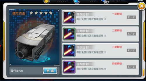 (5)辅助装备德拉克炮可提升每日免费扫荡次数,随其星级增长,最高能将免费次数增加至25次。