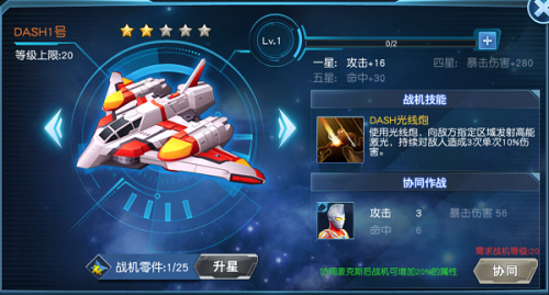 当DASH1号战机达到2星20级,即可协同麦克斯出战并接受后续改造;战机升星会直接提升麦克斯的属性;未协同时战机可单独出战并释放技能,但不提供属性加成。
