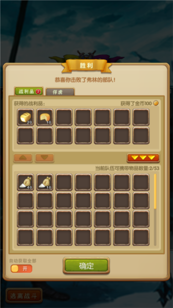 7. 胜利后,可以查看并获取战利品、俘虏以及金币奖励。