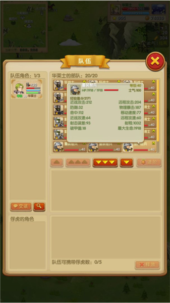 4. 在人物面板中,可以选择英雄与士兵组成出战队伍。