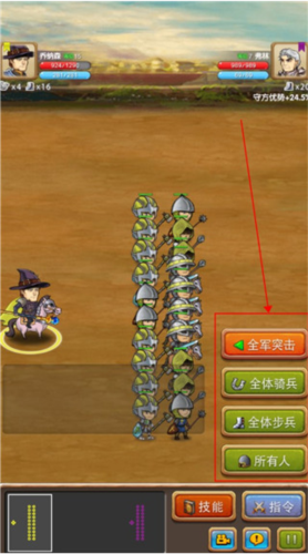 5. 战斗时,点击右下角指令按钮,可以指挥特定兵种行动或下令全军进攻。