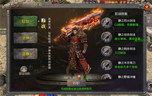 终极技能为静之逐日剑法,突袭前方四格内敌人,造成巨额伤害;PVE建议与道尊组队提升效率;战斗常用组合:烈火接野蛮,配合开天斩与刺杀,半月有机会触发攻杀剑法,一套连招可重创脆皮目标;作为近战职业,需精准把握走位与技能释放时机;可觉醒进阶为剑神、霸刀或狂魔。