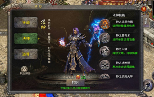 终极技能静之流星火雨,对区域内最多八名敌人造成高额群体伤害;魔法盾提供强大生存能力,可聚怪后交替使用灭天火与流星火雨输出,刷怪效率位居三职业之首;战斗时需保持距离避免近身,利用火墙限制对手走位,以远程技能进行风筝消耗。