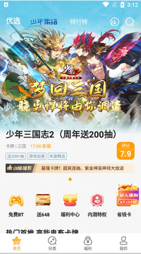 2、首页分为优选推荐、少年集结及排行榜等区域;