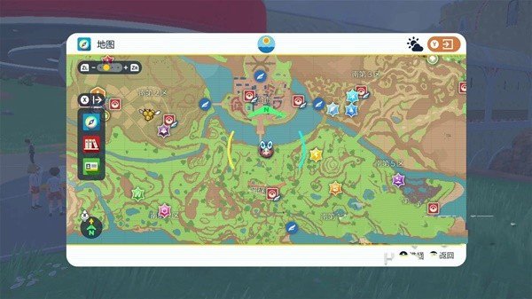 按Y键打开地图,ZL/ZR缩放,右摇杆旋转;地图上黄色叹号为主线目标,精灵球图标为宝可梦中心,已访问的可快速传送。