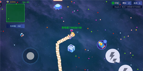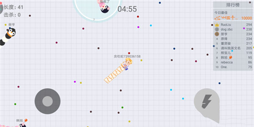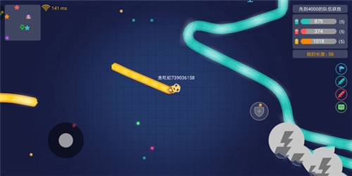 3、长按加速键可提升速度,利用灵活走位让其他蛇撞上你的蛇身,从而吞噬它们。