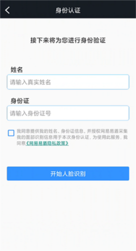 输入姓名与身份证号,勾选同意《网易易盾隐私政策》后开始验证。