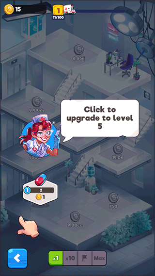 3、使用赚取的金币为每位医生进行升级,增强其诊疗能力;