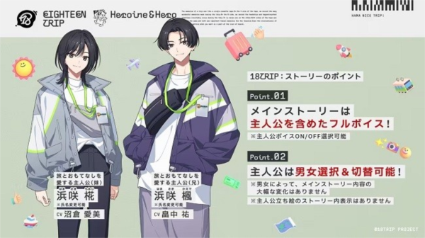 滨咲椛/滨咲枫是玩家扮演的主人公,热爱旅行与款待他人。角色性别可选且可随时切换,主线剧情为全语音,剧情内不显示主角立绘。配音由沼仓爱美(妹妹)或畠中祐(哥哥)担任。