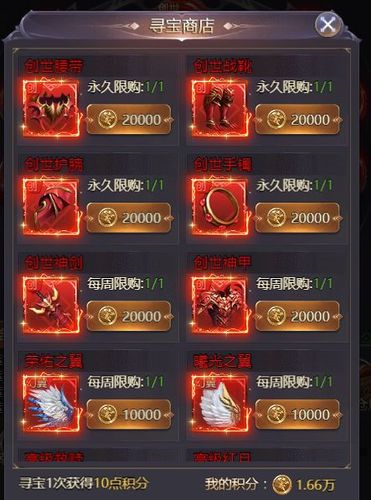 寻宝有概率直接获得金色翅膀、红色装备及时装等珍贵道具;每次寻宝还可获得10积分,积分累积到指定数量后,可直接兑换红色品质女神或红色装备。