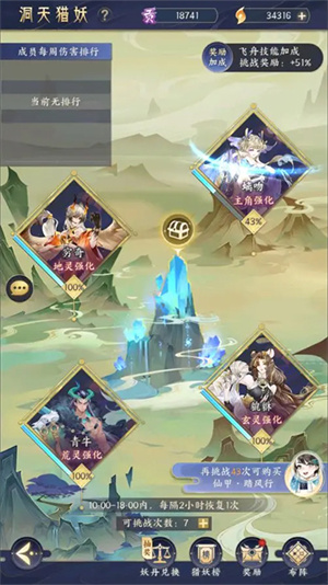 洞天猎妖的挑战次数每日刷新,建议在十二点至十四点或十八点至二十点的奖励加成时段内进行挑战。