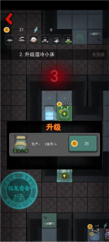 4、进入对局后,在倒计时结束前找到一个无人房间,跟随绿色指引进入并关好门,然后上床睡觉以持续获得金币;完成升级床铺、大门或建造设施等任务也能领取金币奖励。