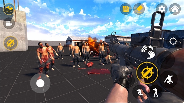 2、进入沙盒世界后,利用屏幕左右两侧虚拟按键控制人物移动、跳跃、蹲下及射击等动作;