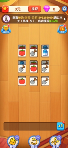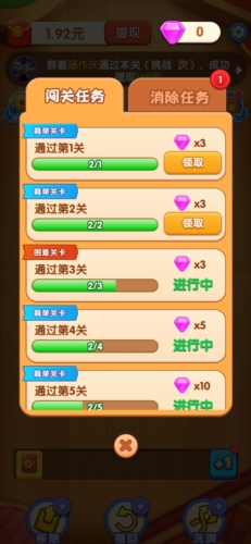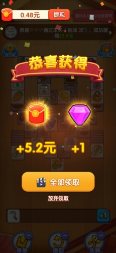 可以获取收益,不擅长游戏的玩家可先领取前两个红包;后续订单要求数量较多,需要投入时间,过关后即可提现;方块大挑战属于三消小游戏,体验前两关就能得到0.48元红包。