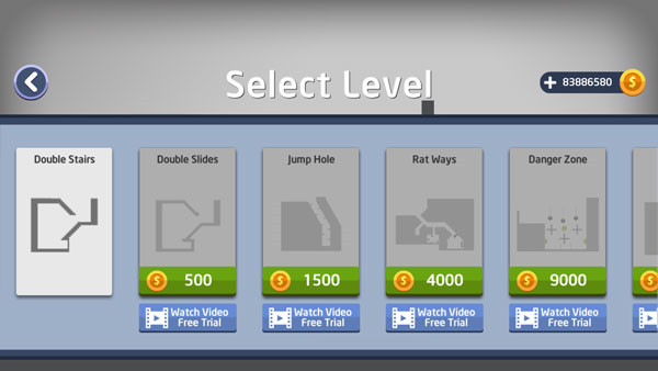 5、关卡界面中,除第一关外,其余关卡均需消耗金币解锁;可通过反复游玩已解锁关卡积累金币。