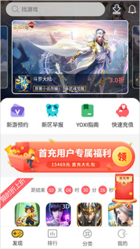 1、进入软件后,用户可以在【发现】模块中查看新游预约、新区早报、YOXI指南和快速充值等功能;