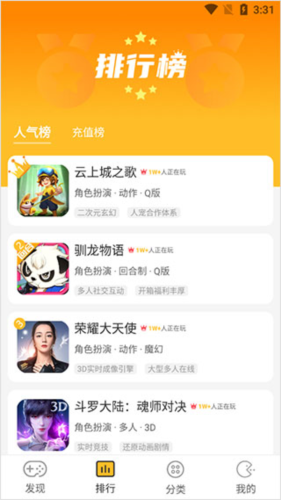 2、在【排行】中,用户可以查看人气榜和充值榜,辅助选择游戏;
