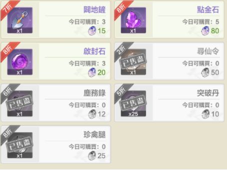 (4)绑玉商店每日必买项:3个单价50绑玉的寻仙令、2个单价25绑玉的珍禽腿、100枚突破丹、5张派遣道具。天命印不建议购买。