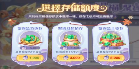 (7)“聚财宝盆”活动需投入8000绑玉,此活动务必参与。每轮活动结束后会立即刷新,坚持参与每月可稳定获得约32000绑玉回报。