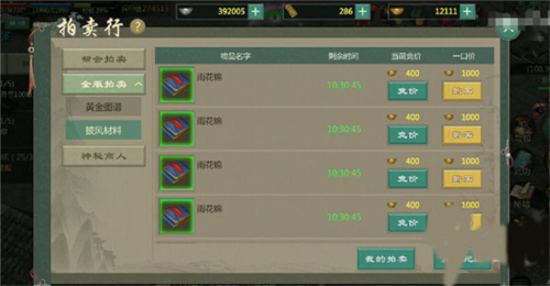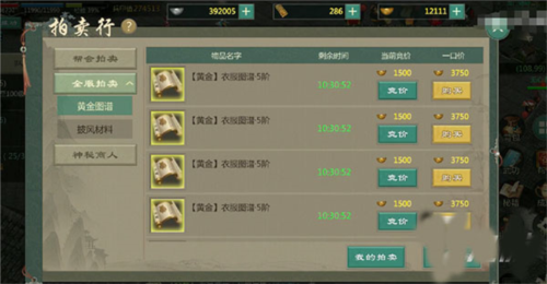 全服拍卖长期开放,但上架物品种类较少,主要为黄金图谱与披风材料两类;图谱是制作高级装备的必需图纸,披风材料则用于提升披风等级、获取属性加成;购买方式同样包括竞价与一口价,玩家可根据需求选择。