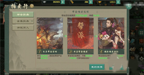拍卖行在角色达到30级后开放,相比摆摊更为高级;该玩法分为帮会拍卖、全服拍卖与神秘商人几个部分,各自具有不同的规则与机制。