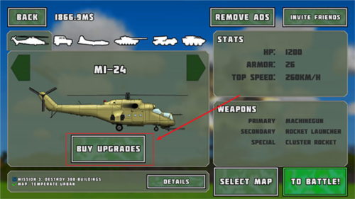 3. 成功购买装备后,点击【BUY UPGRADES】可进入武器升级界面。