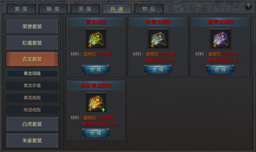 1、【青龙套装】包括青龙项链、手镯、戒指及传送戒指,属性偏向道士职业;传送戒指附赠移形换位技能,可向前瞬移四格距离。