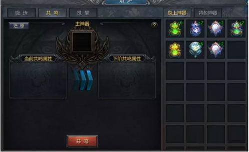 2、神器共鸣。相同品质的神器可进行共鸣,以此激活主神器的额外属性。共鸣等级从+1开始显示,达到+2后开始激活共鸣属性。随着共鸣等级提升,所需材料也会增加。已共鸣的神器可以还原,获得共鸣灵质用于后续消耗。