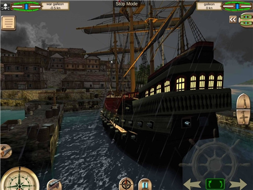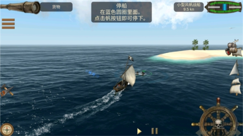 游戏提供三种操控模式:直接手指滑动舵盘旋转;点击舵盘下方左右箭头进行快速满舵转向;或点击长方形按钮,通过倾斜设备来操控船只航向。