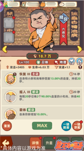 六师兄会定期召唤两个小和尚进入战场,协助攻击并吸引敌人;其被动技能可提升自身防御力,开启主动技能后,每秒能为小和尚回复气血。作为前期较易获得的召唤型伙伴,在输出不足、敌人容易逼近老屋的阶段,可以考虑派遣六师兄上阵。