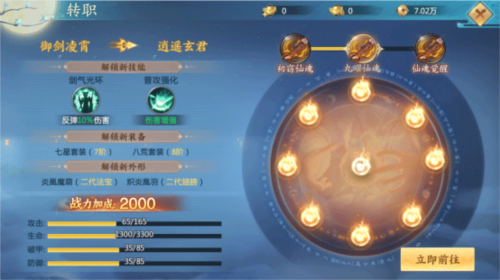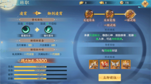 游戏为凌霄设计了多重转职路径;角色达到指定等级后,完成转职任务即可转职,获得大量战力加成,解锁高阶装备、法宝及翅膀外观,并提升技能效果。